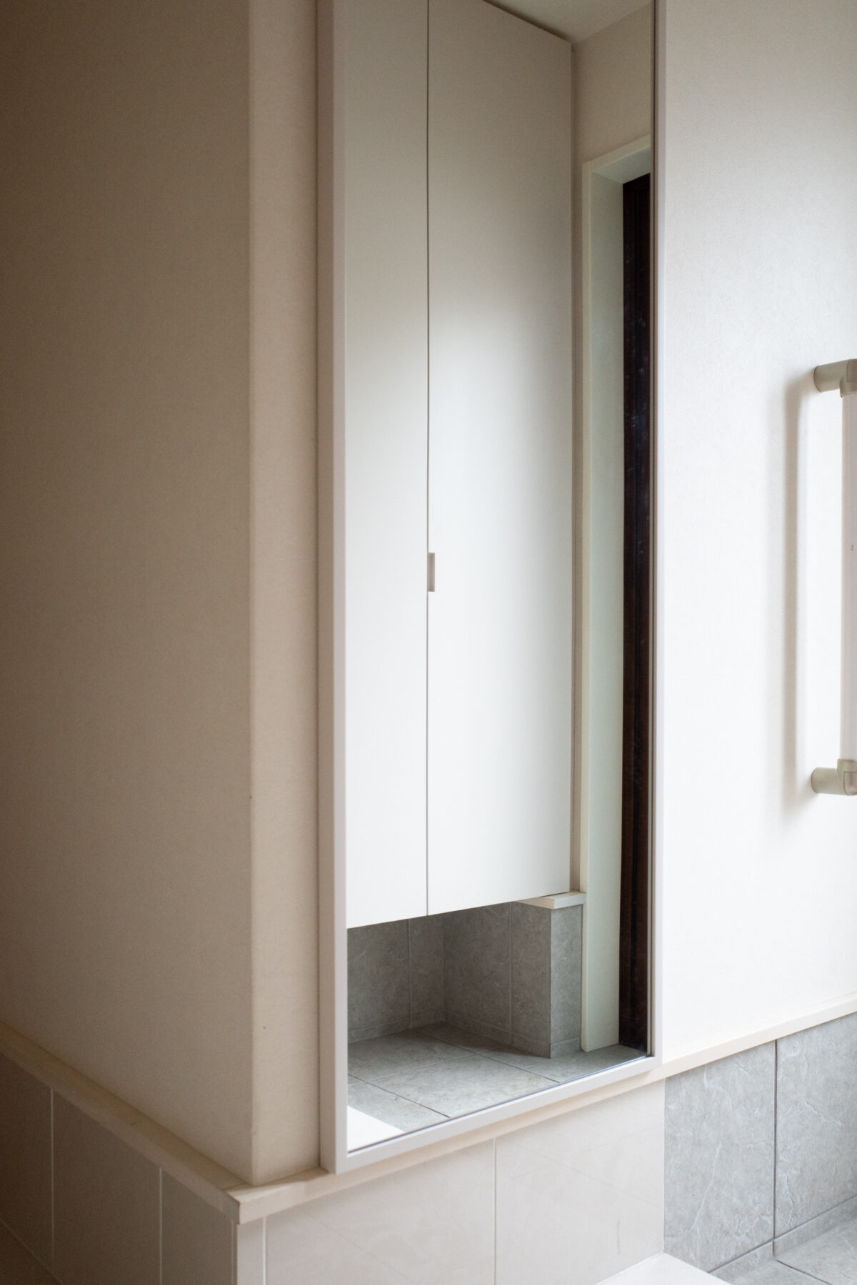 向かいの壁には、玄関収納とおそろいの色で姿見としてのミラーを設置。