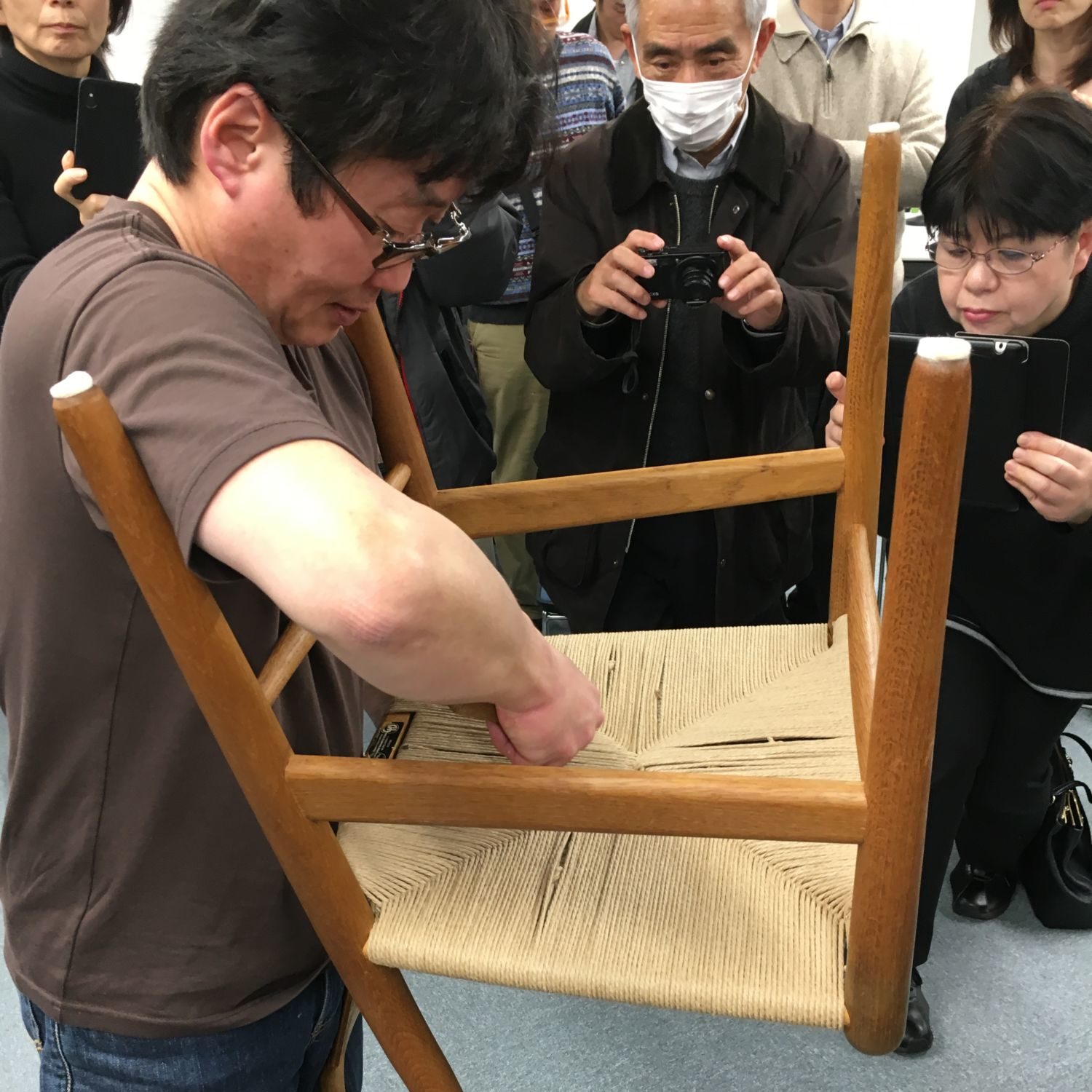 Yチェアの歴史やコピー製品対策など講義も大変興味深い内容でしたが、後半に催された張り替え実演がとても面白かったので、画像で恐縮ながらダイジェストでご紹介します。