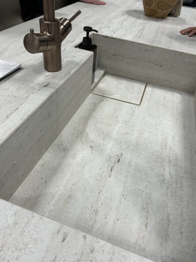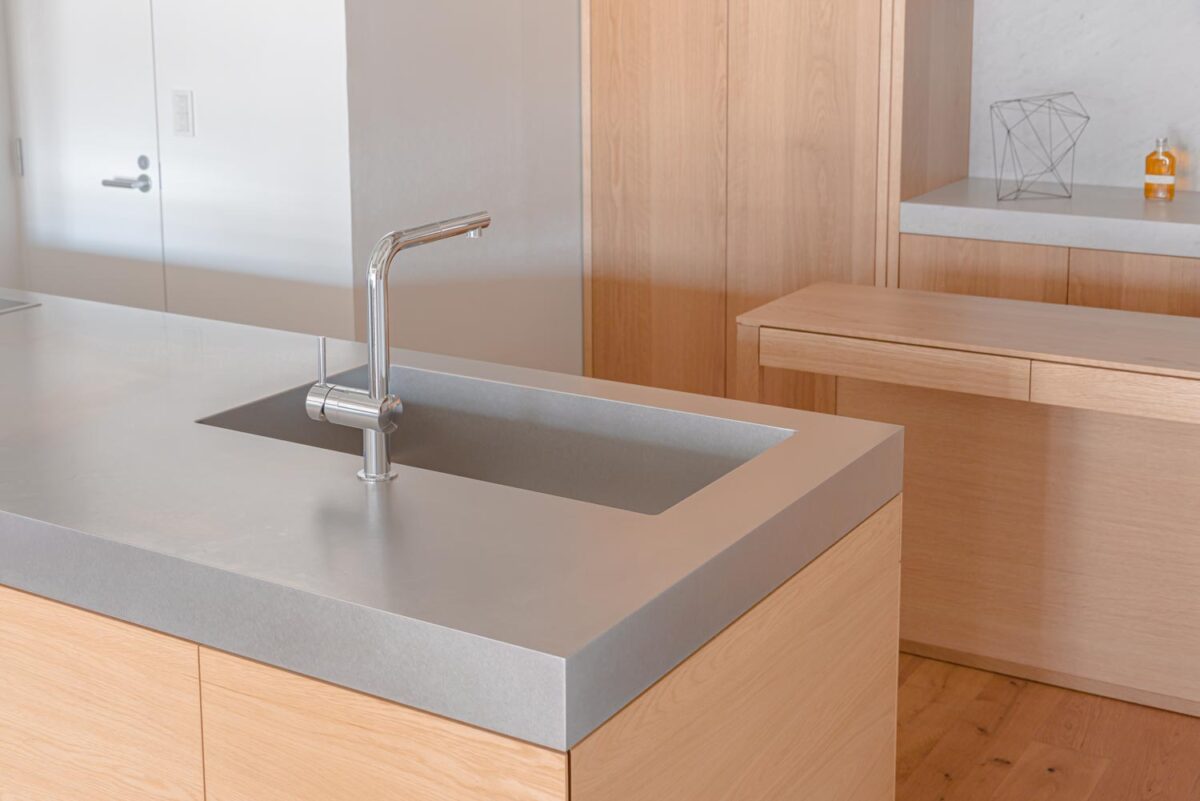 セラミックで天板もシンクも同素材に合わせることにより、高いクラス感を演出できます。↓