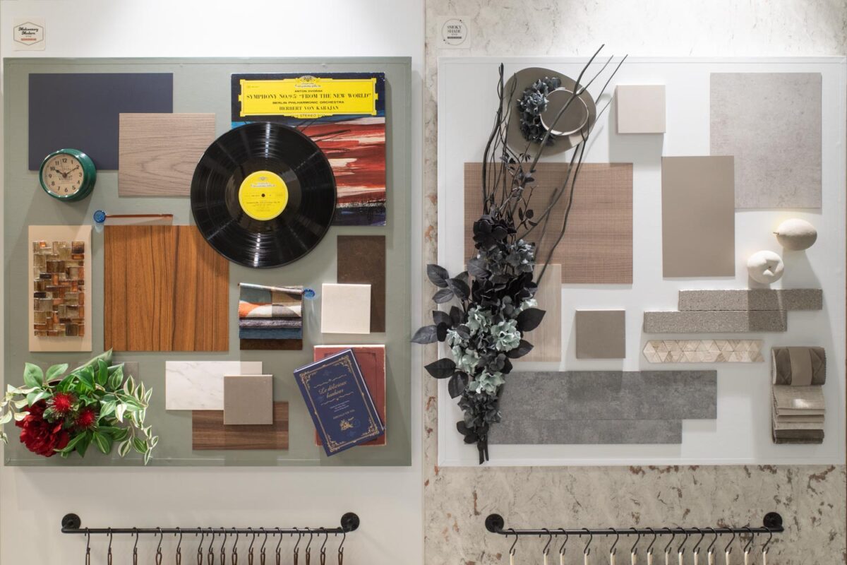 先日、久しぶりに新宿にある化粧板メーカーのアイカ工業ショールームに行ってきた時に見つけた、マテリアルのプレゼンボード。