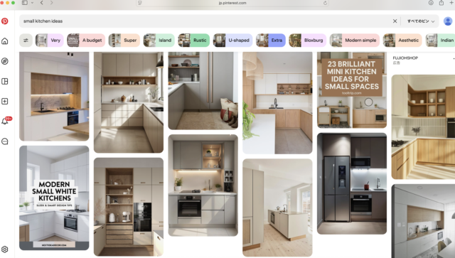 pinterestの画面。検索ワードにそった画像がたくさんでてきます。