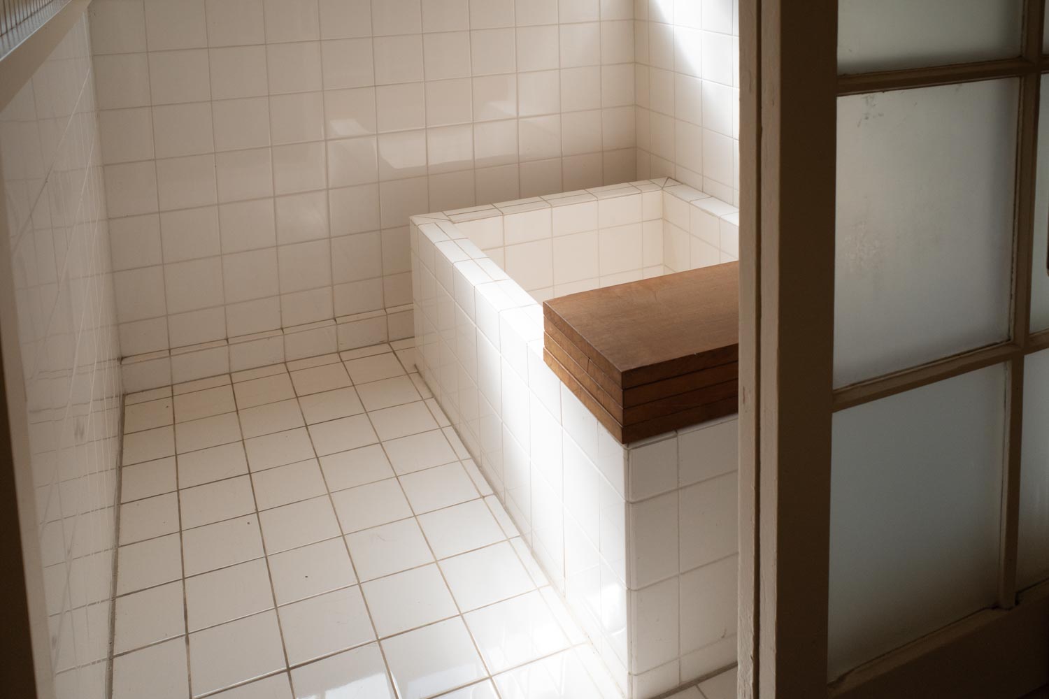シンプルな白いタイル貼りの浴槽に木板の組み合わせがいい感じ。